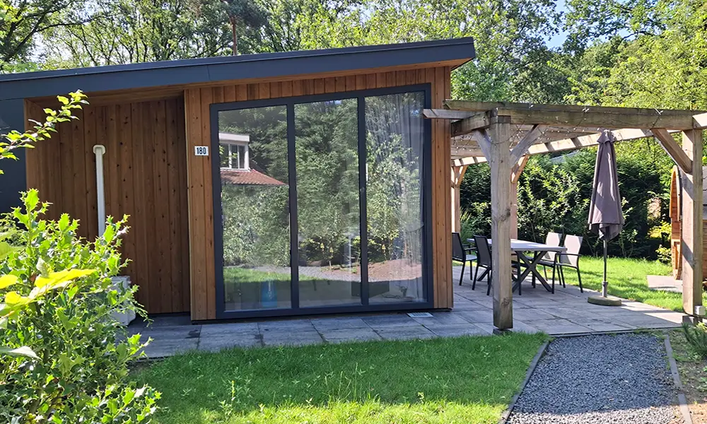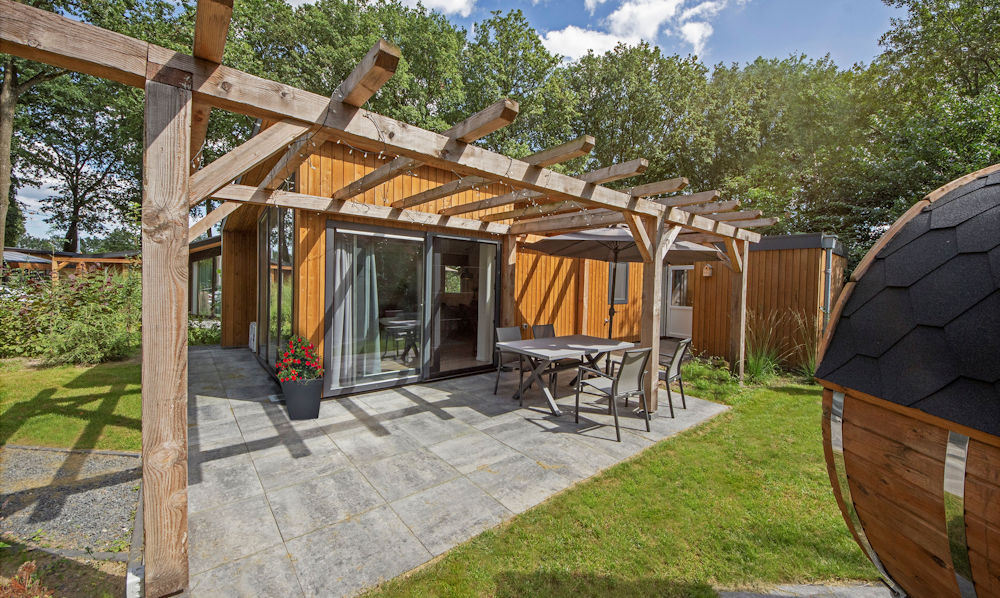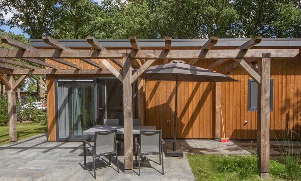 Modern chalet met hoge ramen, pergola en eigen parkeerplaats voor de deur.