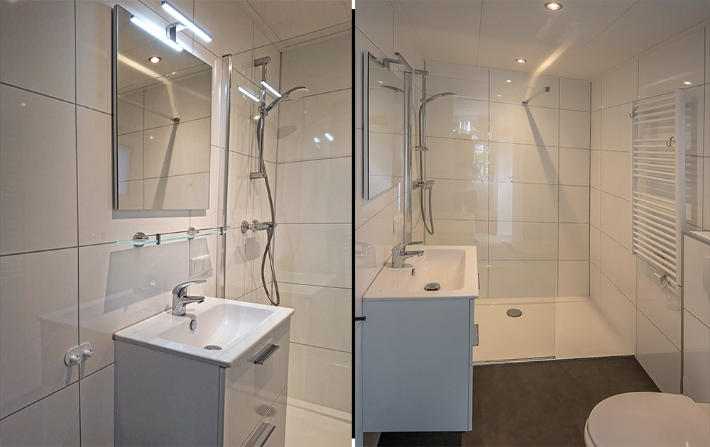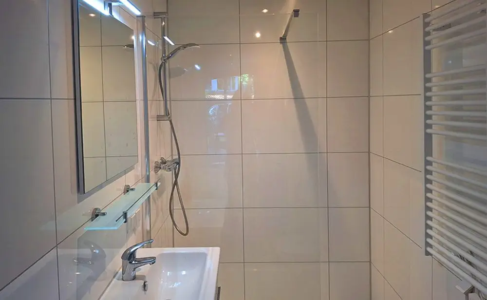 Ruime badkamer met inloopdouche, verwarming en kiepraam met een hoor.