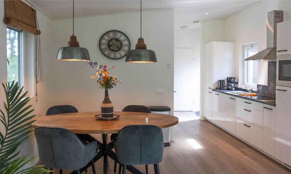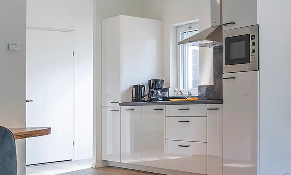 De keuken is voorzien van alle gemakken zoals een inductiekookplaat, vaatwasser, combi-magnetron en koel-vriescombinatie.