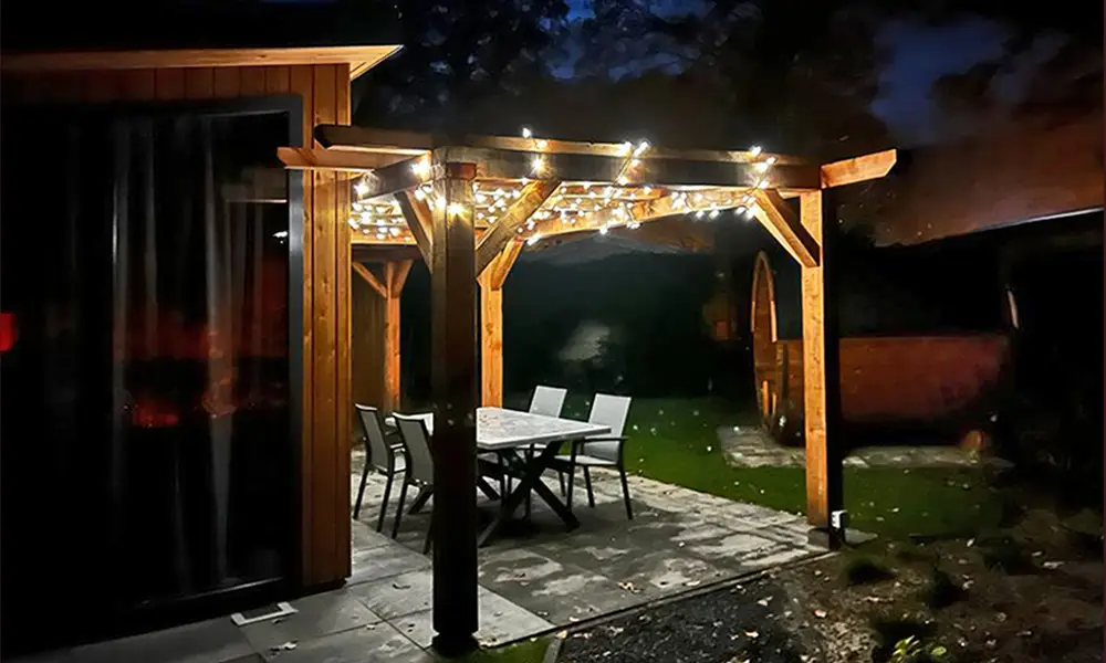 Op een zwoele zomeravond buiten zitten met de lichtjes aan en een saunaatje pakken.